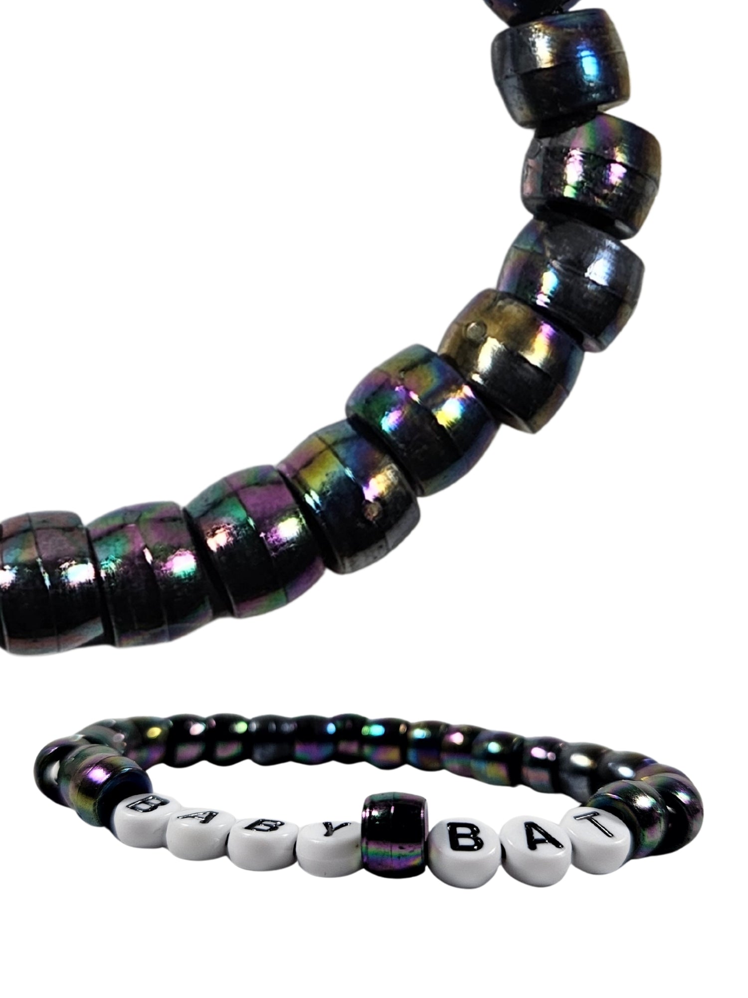 Each bracelet is handmade using black iridescent and letter beads, assembled slowly and intentionally. Made in-house with care, personality, and zero mass production energy.