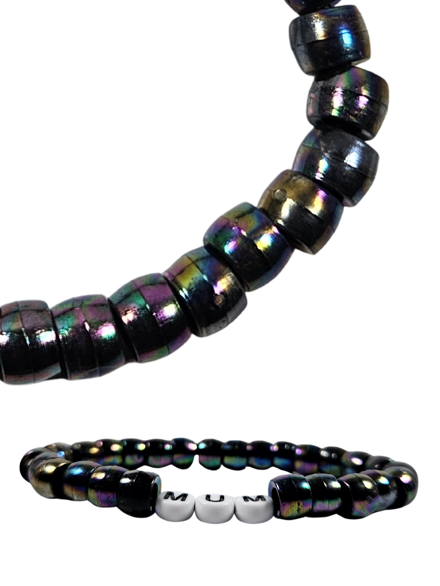 Each bracelet is handmade using black iridescent and letter beads, assembled slowly and intentionally. Made in-house with care, personality, and zero mass production energy.